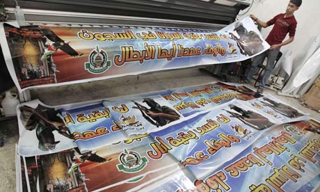Palestinian Hamas is making banners to celebrate the prisoner swap which will free Israeli soldier Gilad Shalit. Photograph: Mohammed Abed/AFP/Getty Images
